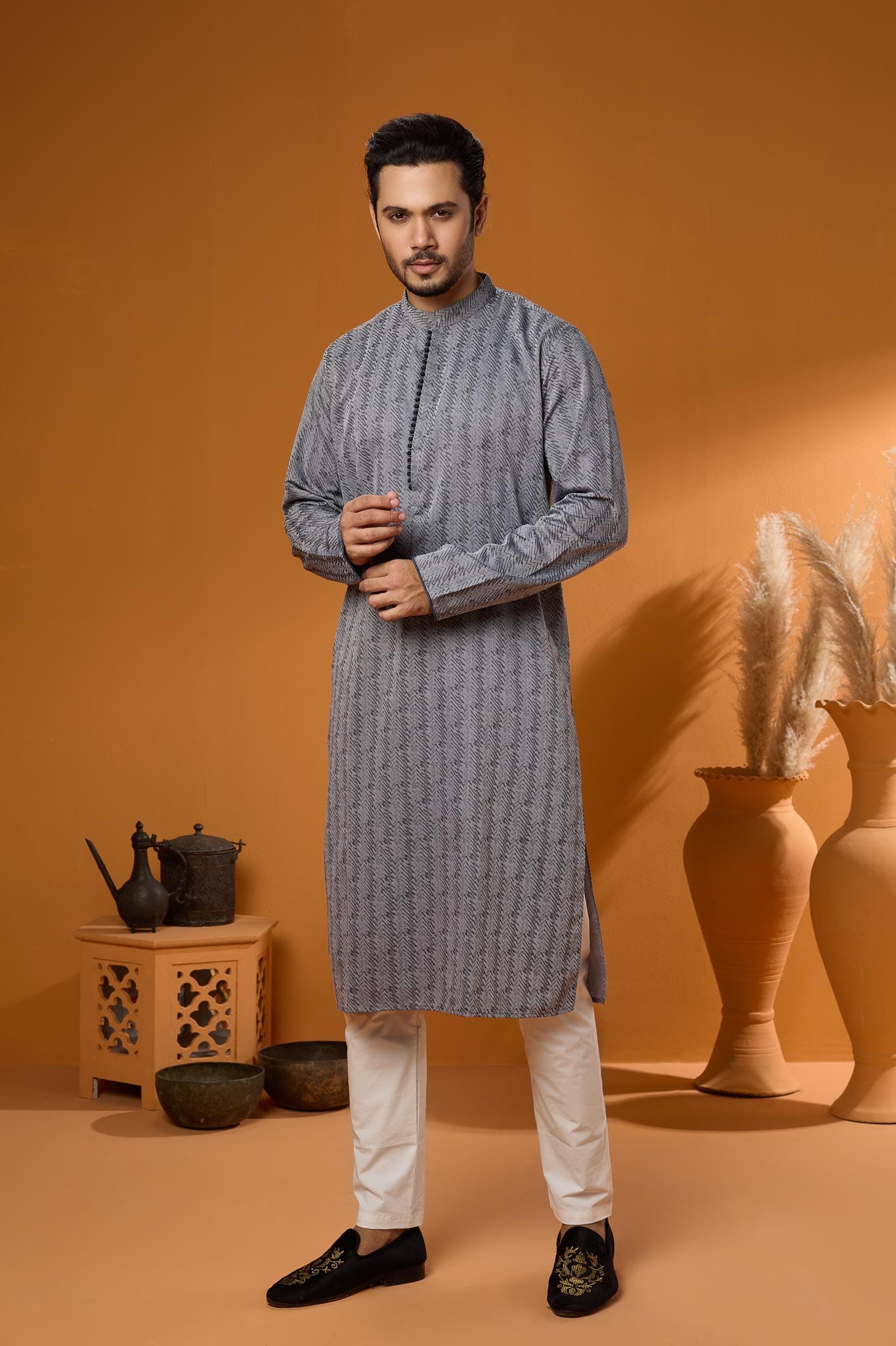 Introducing our Exquisite Bamboo Silk Panjabi. Tailored from Luxurious Bamboo Silk, this Panjabi showcases Elegant Design and a Touch of sophistication. This Panjabi features Gundi Handwork on Button Plate, allowing the rich Ash Print colour to take centre stage, making it a versatile choice for both formal events and festive gatherings. The exterior Carrys a rich Design Detailed Precisely to add a  modern flair. Designed with attention to detail, the fiver buttons not only enhance the overall aesthetics but also ensure durability.
