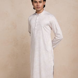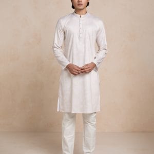 The elegant ivory base is enhanced with a subtle all-over floral print, adding texture and depth without overpowering the look. Finished with a clean mandarin collar and minimal button detailing for a sharp classic silhouette.