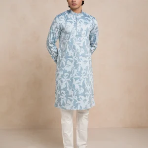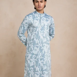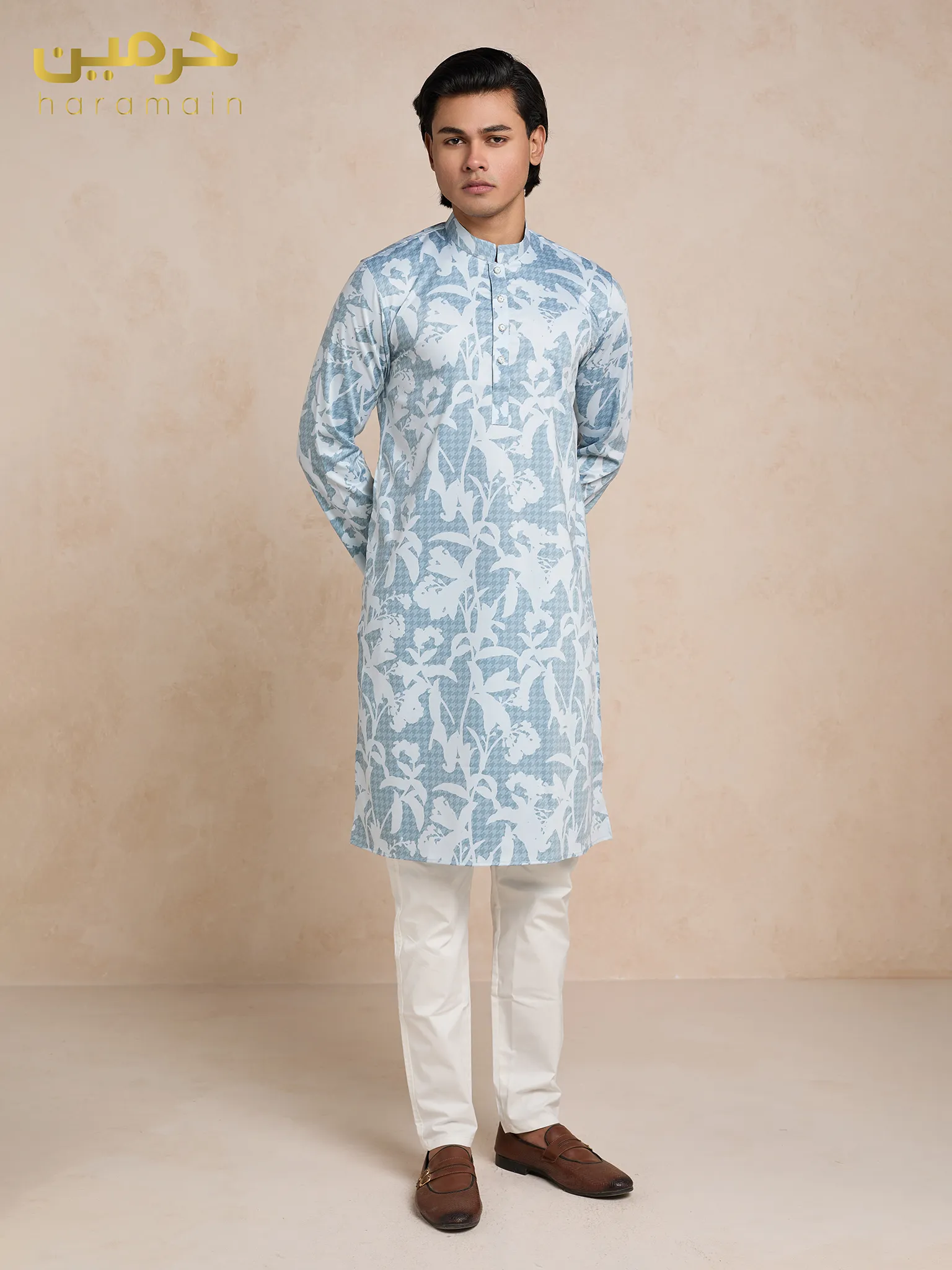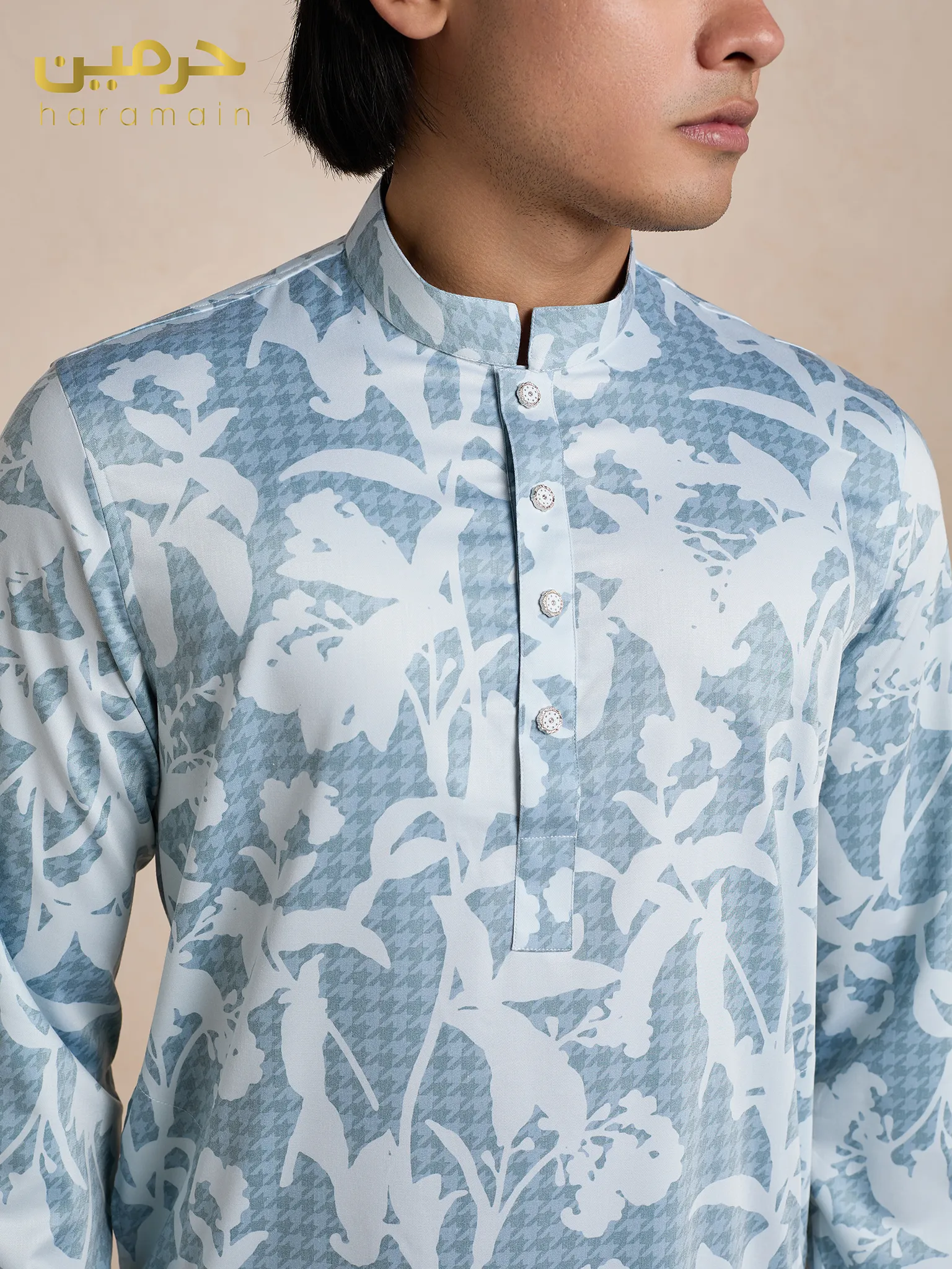 The refreshing sky blue base features a bold all-over floral print layered over a subtle textured background, creating depth while maintaining a clean, elegant look. Finished with a structured mandarin collar and refined button detailing for a sharp classic silhouette.