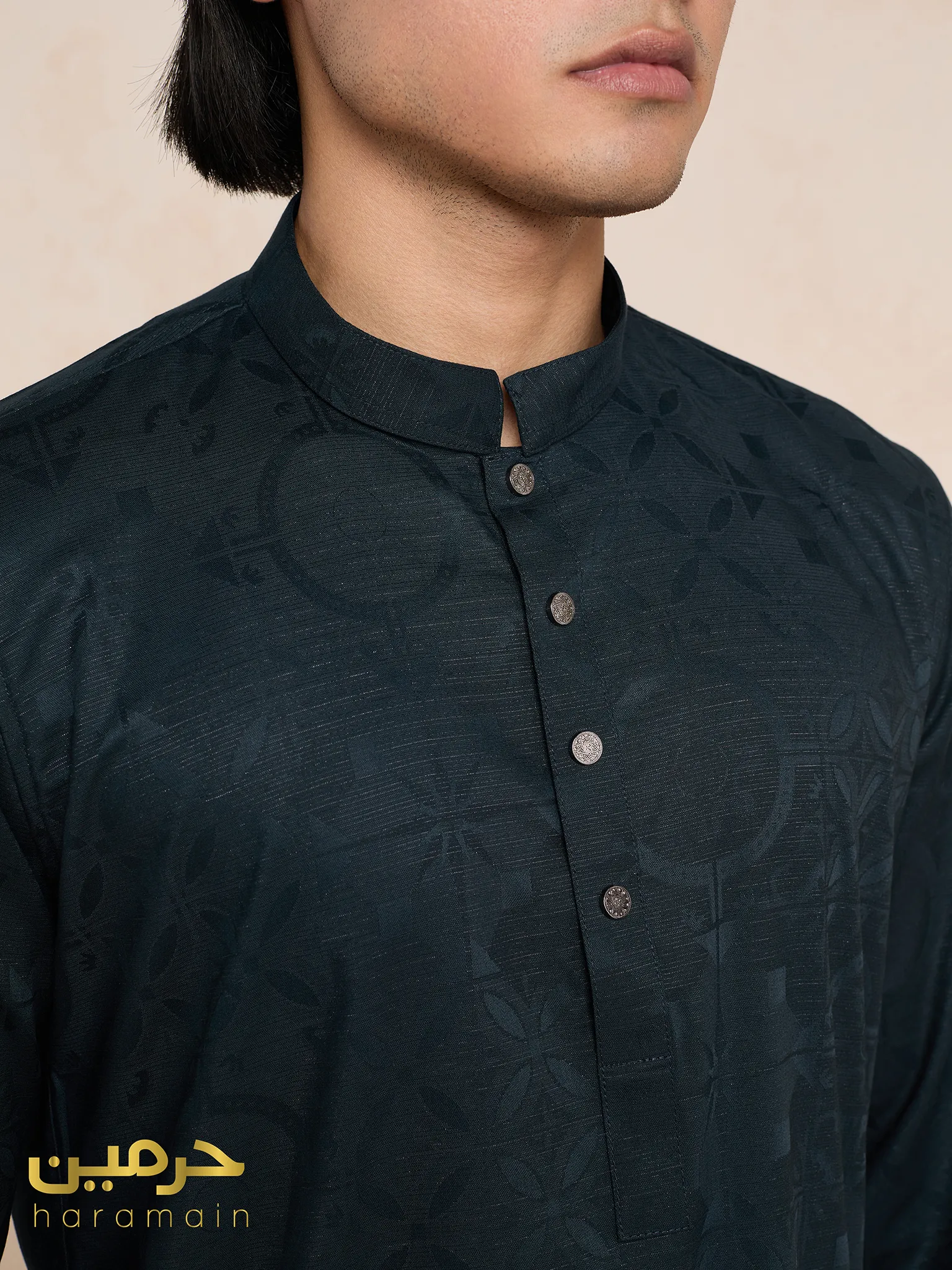 The all-over shadow print with subtle zari texture adds depth and a soft sheen without overpowering the look. Clean stitching and antique matte buttons complete the refined and timeless design.