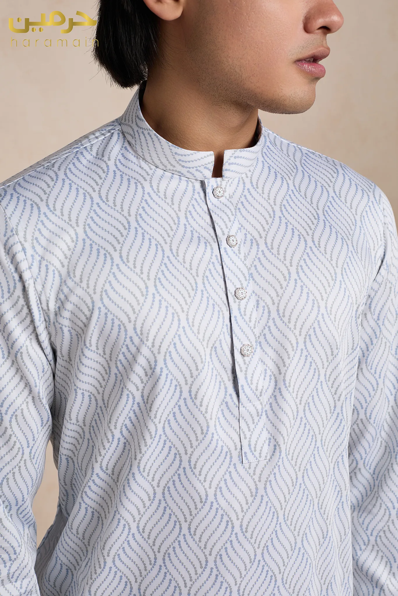 The mist grey base features a subtle all-over wave pattern that adds texture without overwhelming the look. Clean mandarin collar and refined button detailing complete a balanced, modern classic silhouette.