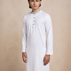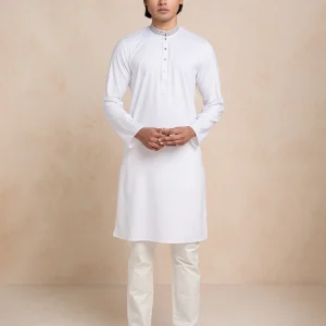 This premium panjabi is crafted from bamboo silk fabric, offering a smooth, lightweight, and breathable feel with a refined finish. The subtly textured body adds depth, while the embroidery detailing is placed exclusively on the collar for a clean and elegant touch.