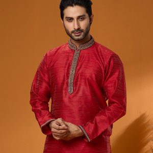 Introducing our Exquisite Panjabi. Tailored from Luxurious Dupion Fabric, this Panjabi showcases Elegant Design and a Touch of sophistication. The interior of this Panjabi features a subtle plain design, The exterior Carry’s a rich Handworked stone Design on Collar, Chest And Sleeves. The Maroon and Yellow colour is carefully chosen to suit various preferences and occasions. Designed with attention to detail, the fiver buttons not only enhance the overall aesthetics but also ensure durability.