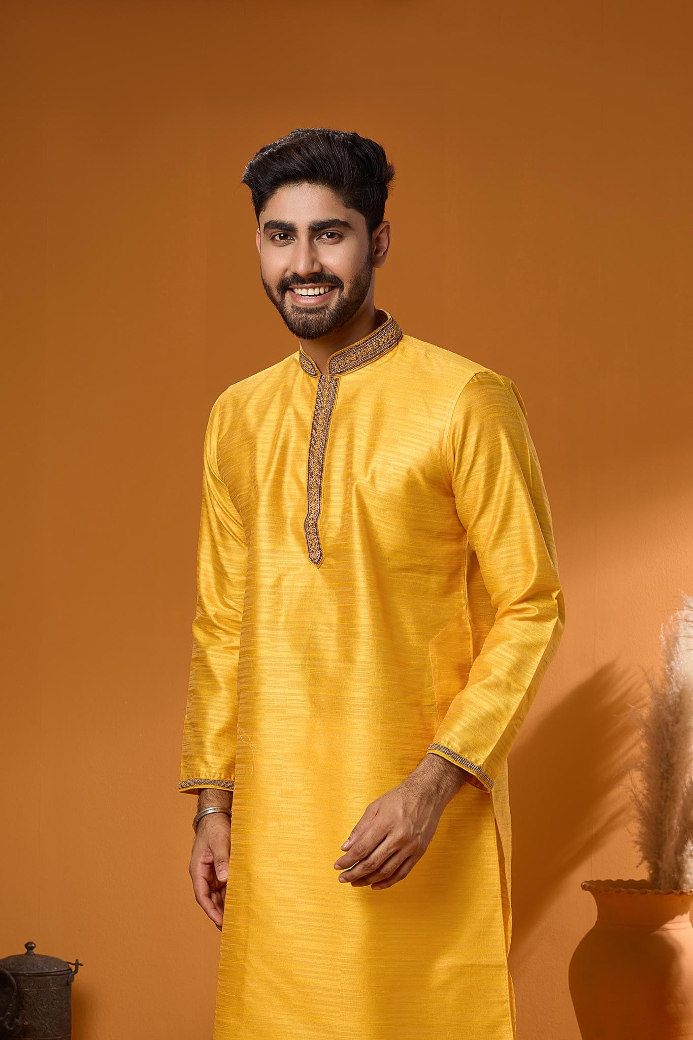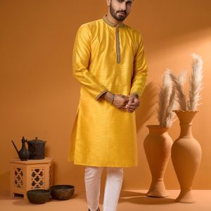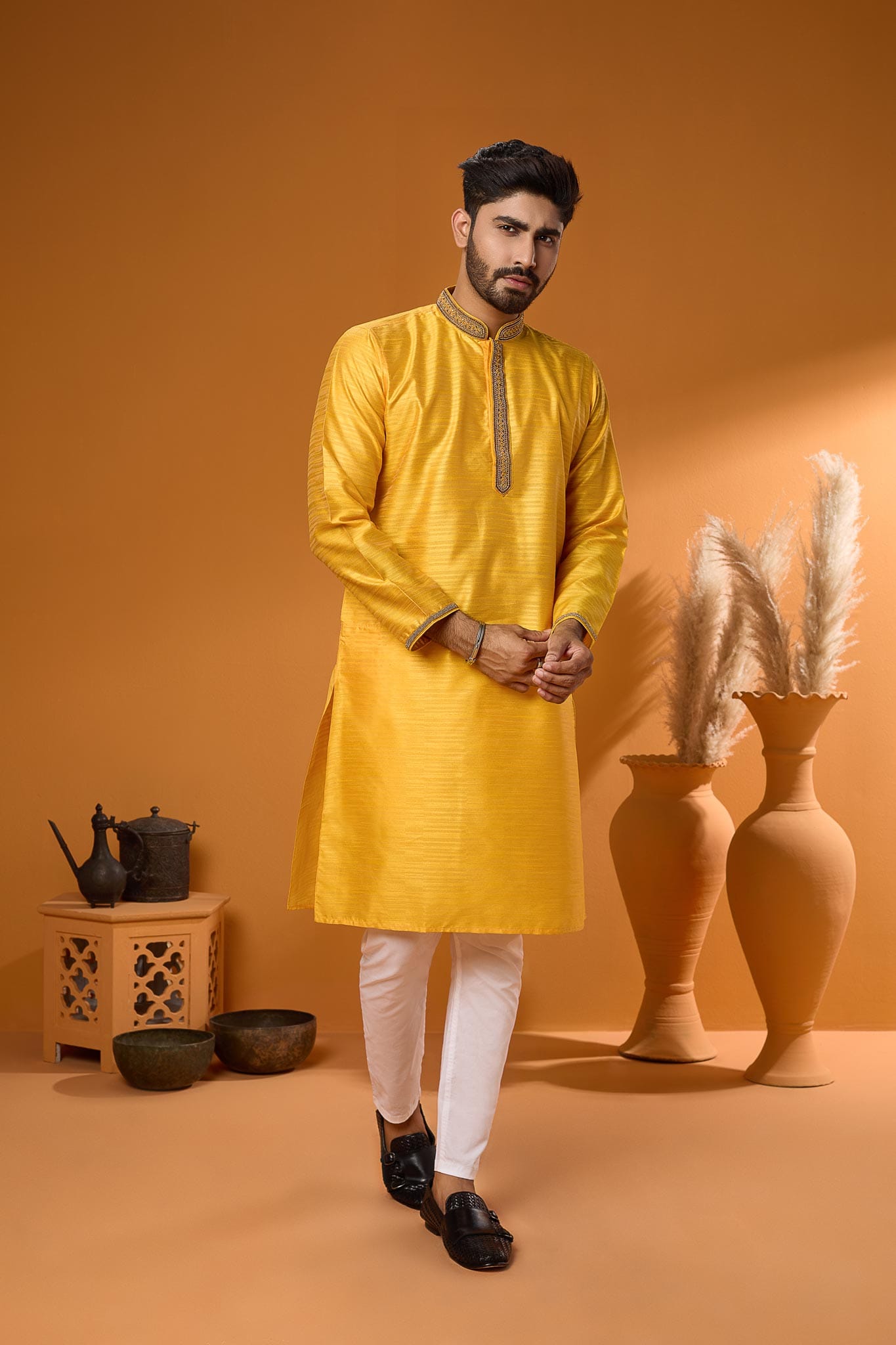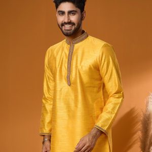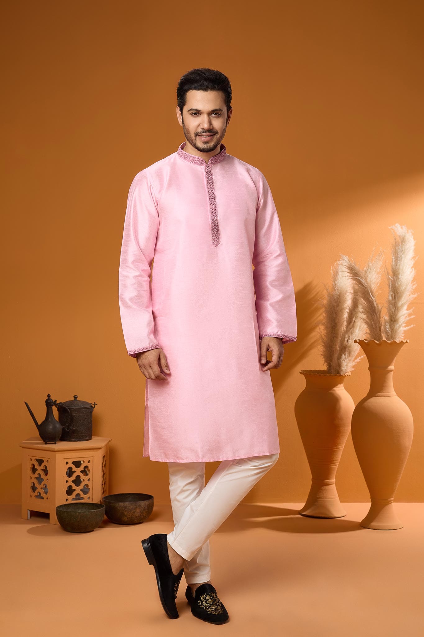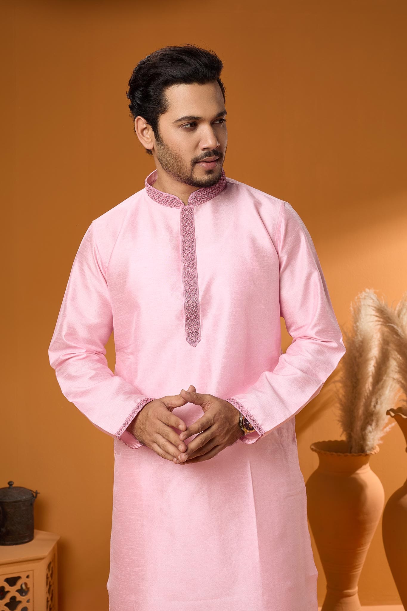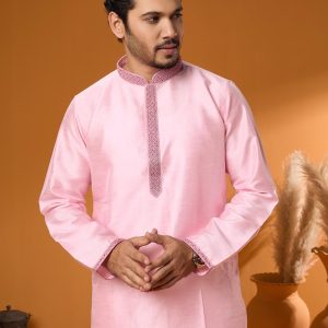Introducing our Exquisite Panjabi. Tailored from Luxurious Dupion Fabric, this Panjabi showcases Elegant Design and a Touch of sophistication. The interior of this Panjabi features a subtle plain design, The exterior Carry’s a rich Design on Collar, Chest And Sleeves. The Pink and Yellow colour is carefully chosen to suit various preferences and occasions. Designed with attention to detail, the fiver buttons not only enhance the overall aesthetics but also ensure durability.