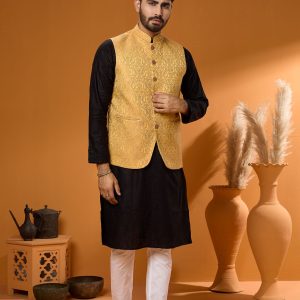 Indulge in the richness of Luxurious Ambush Fabric, complemented by meticulous detailing inside with fusing and Digital print. The Golden hue adds a touch of sophistication along with its detailed Ambush Print. Fitted with Metal Buttons and adorned with royal Floral Design on the chest, this koti is a statement piece.