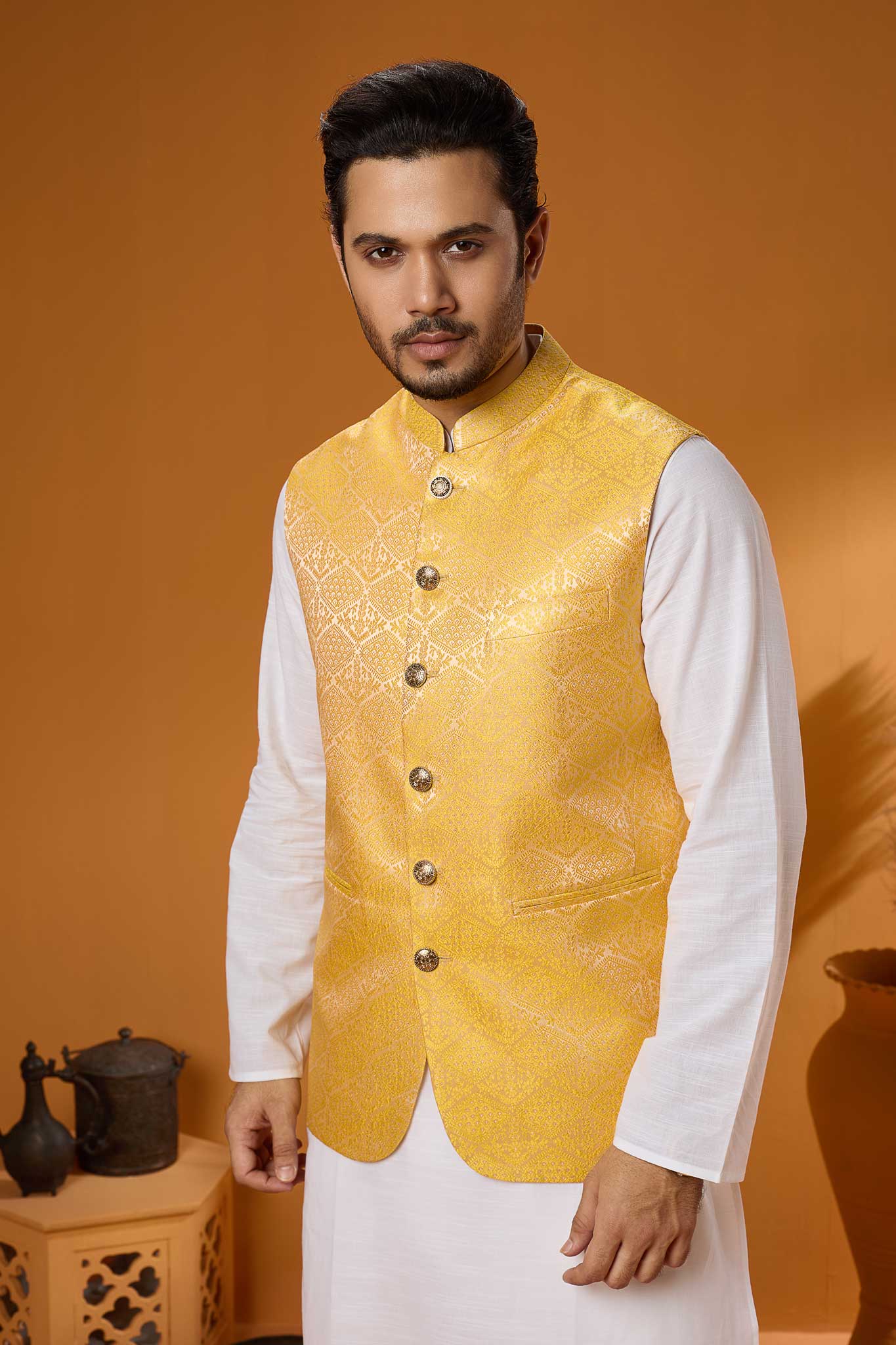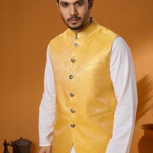 Indulge in the richness of Indian Luxury Ambush Fabric, complemented by meticulous detailing interior with Ambush Print. The Golden hue adds a touch of sophistication. Fitted with Metal buttons and adorned with royal Ambush Print on the chest, this koti is a statement piece.