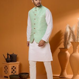 Indulge in the richness of Indian Premium Soft Katan, complemented by meticulous detailing inside with fusing. The Lemon hue adds a touch of sophistication along with its detailed Ambush Print. Fitted with Metal Buttons and adorned with royal Ambush print on the chest, this koti is a statement piece.