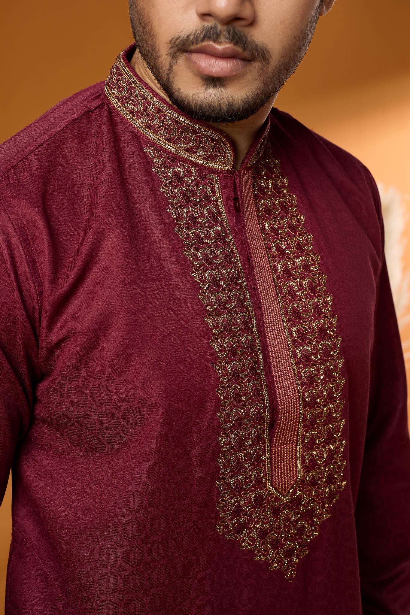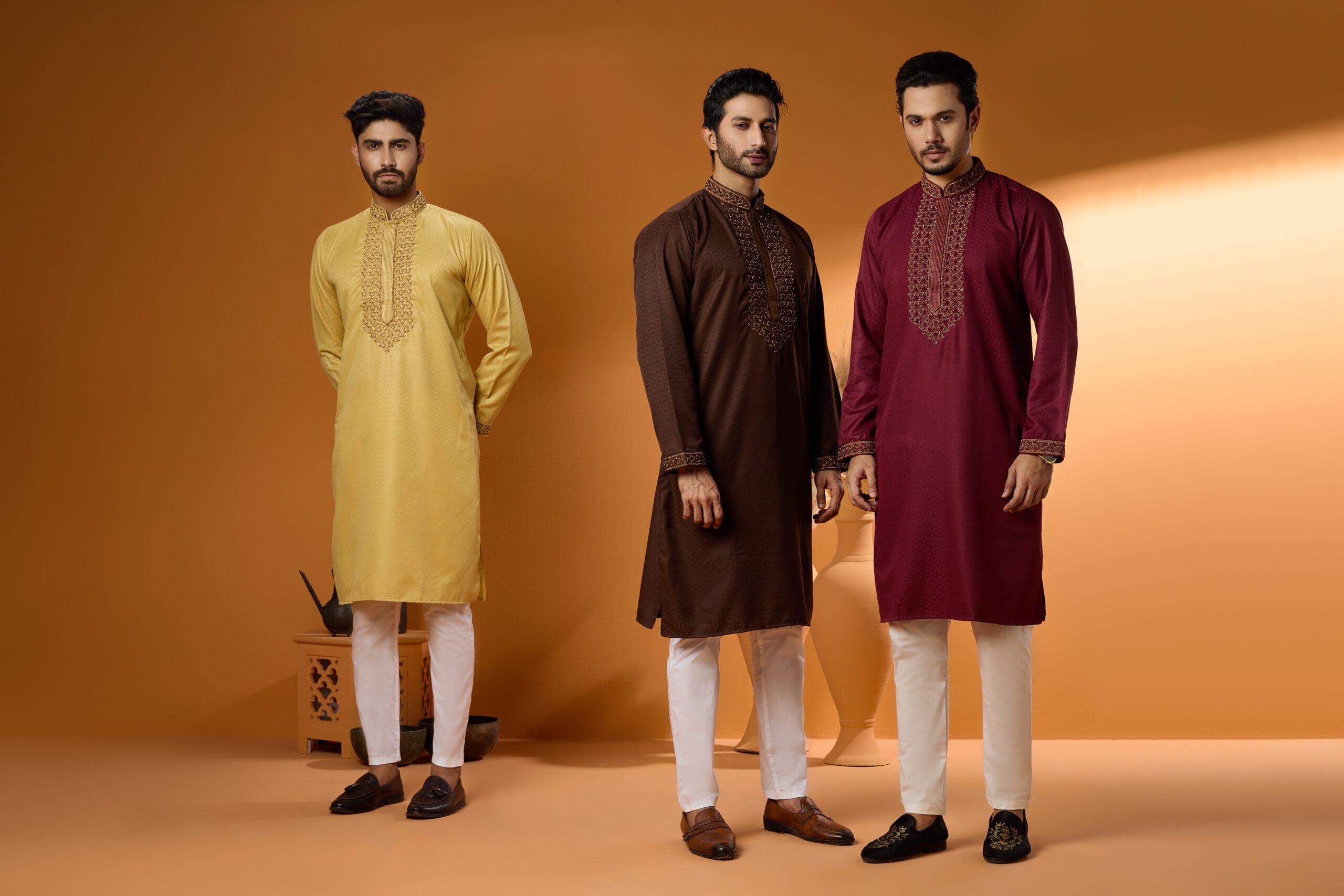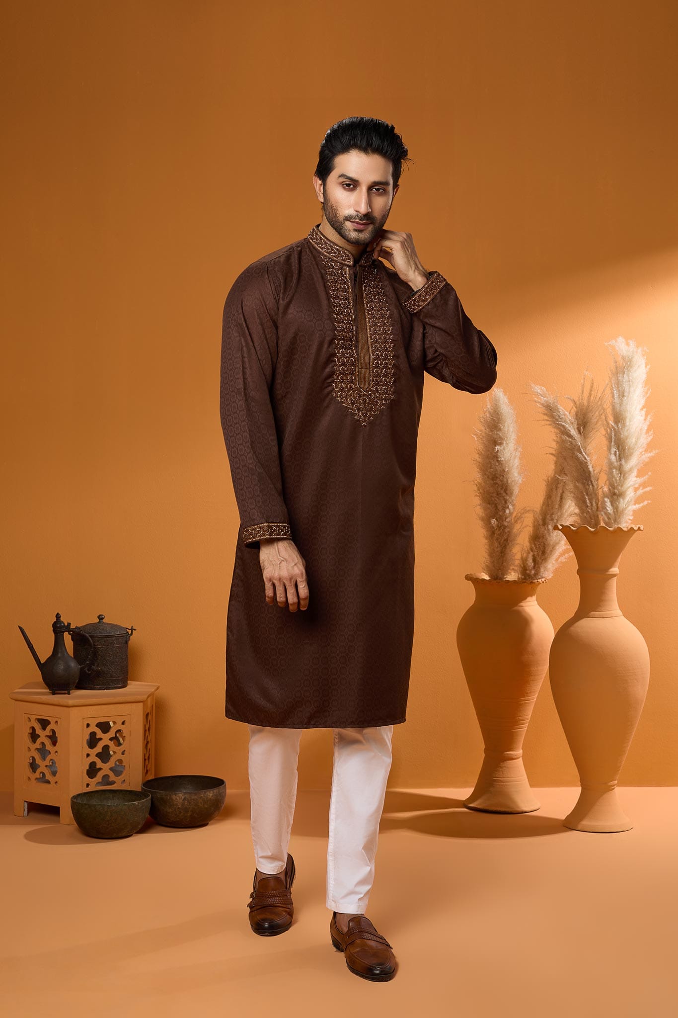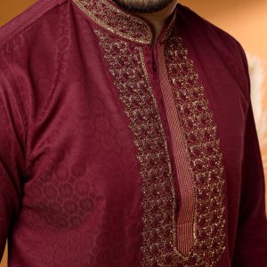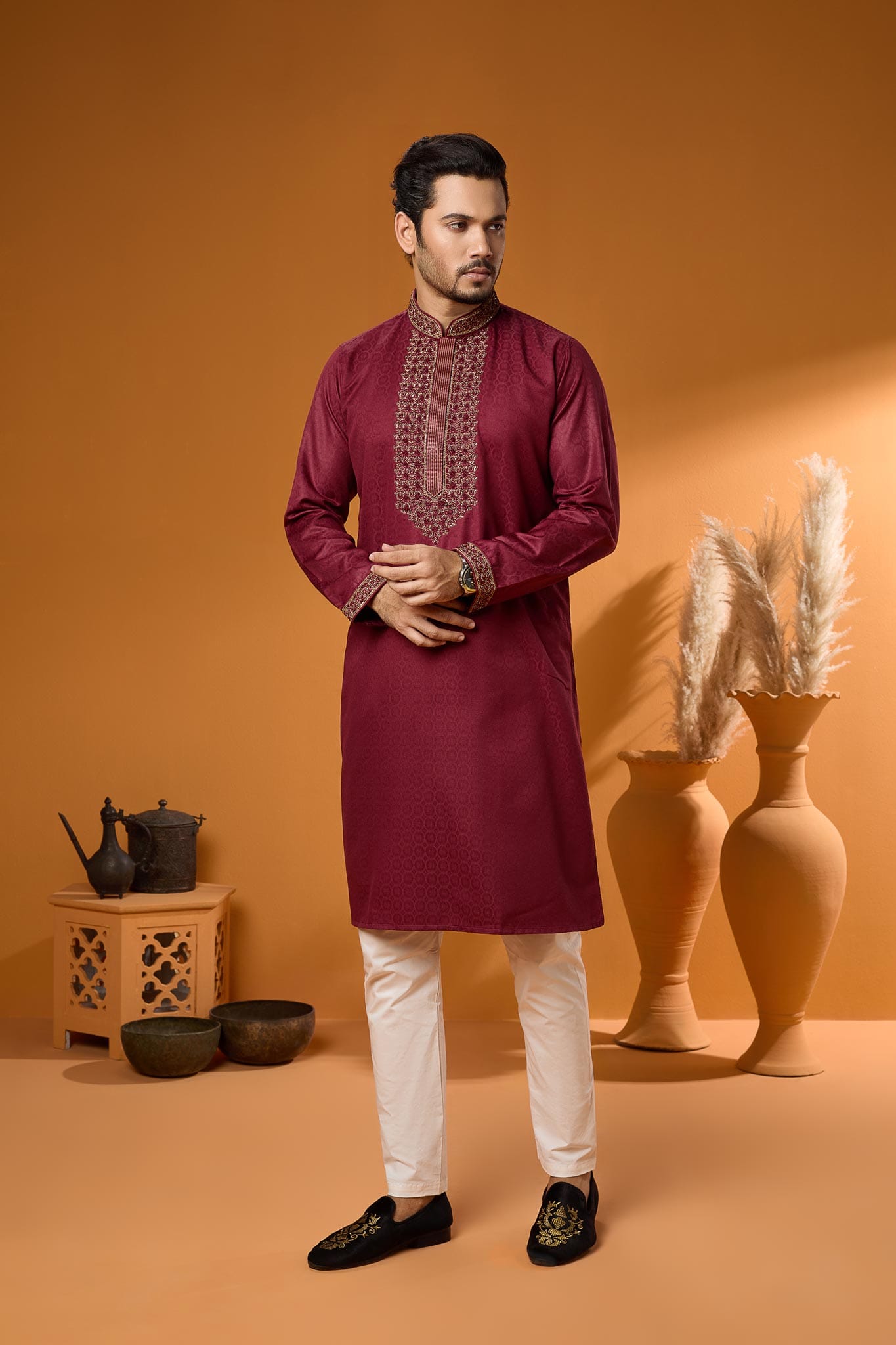 Introducing our Special Edition Panjabi. Tailored from Luxurious Cotton Fabric, this Panjabi showcases Elegant Design and a Touch of sophistication. The interior of this Panjabi features Box design, The exterior Carry’s a rich Handworked stone Design on Collar, Chest And Sleeves. The Olive, Maroon and Coffee colour is carefully chosen to suit various preferences and occasions. Designed with attention to detail, the fiver buttons not only enhance the overall aesthetics but also ensure durability.