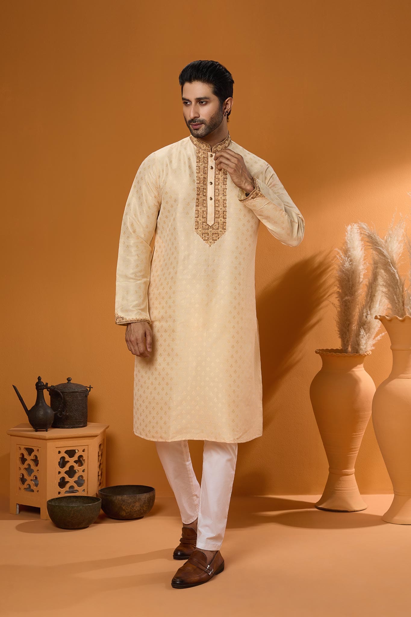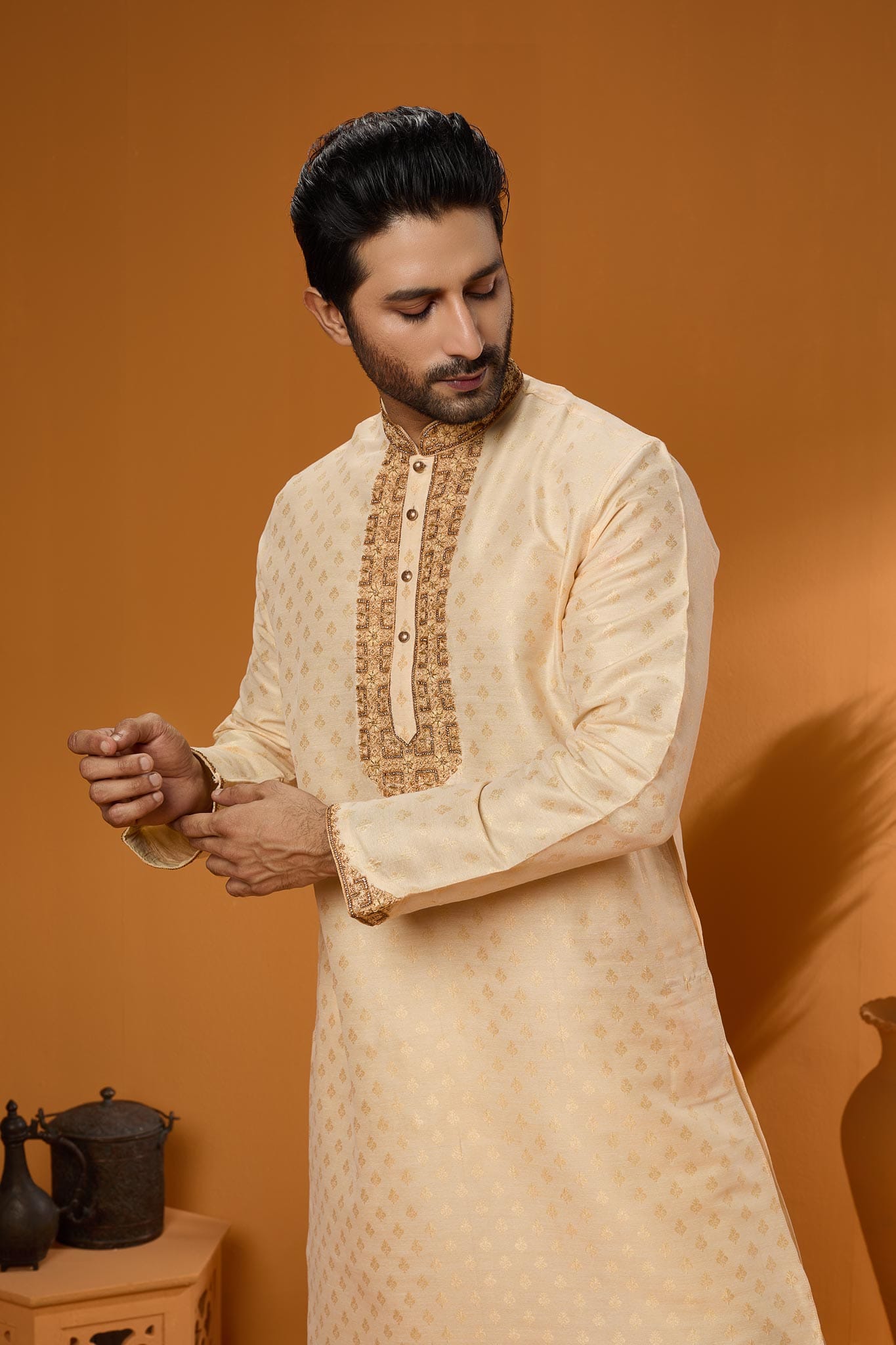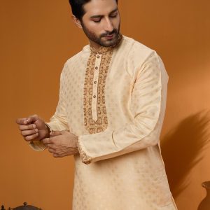 Introducing our Wedding/Party Panjabi. Tailored from Luxurious Soft katan Fabric, this Panjabi showcases Elegant Design and a Touch of sophistication. The interior of this Panjabi features Floral design, The exterior Carry’s a rich Handworked stone Design on Collar, Chest And Sleeves. The Golden is carefully chosen to suit various preferences and occasions. Designed with attention to detail, The metallic buttons add a tasteful finishing touch elevating the overall look with a hint of glamour.