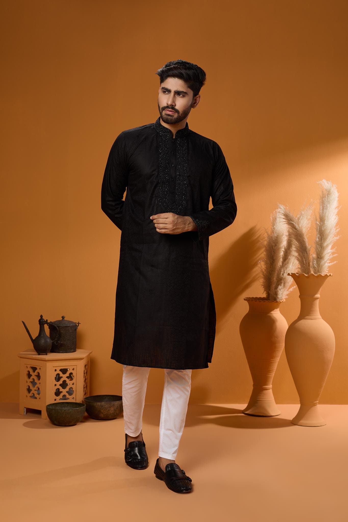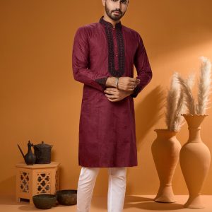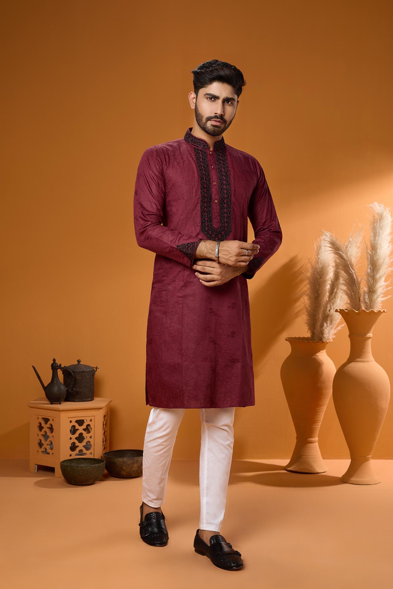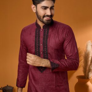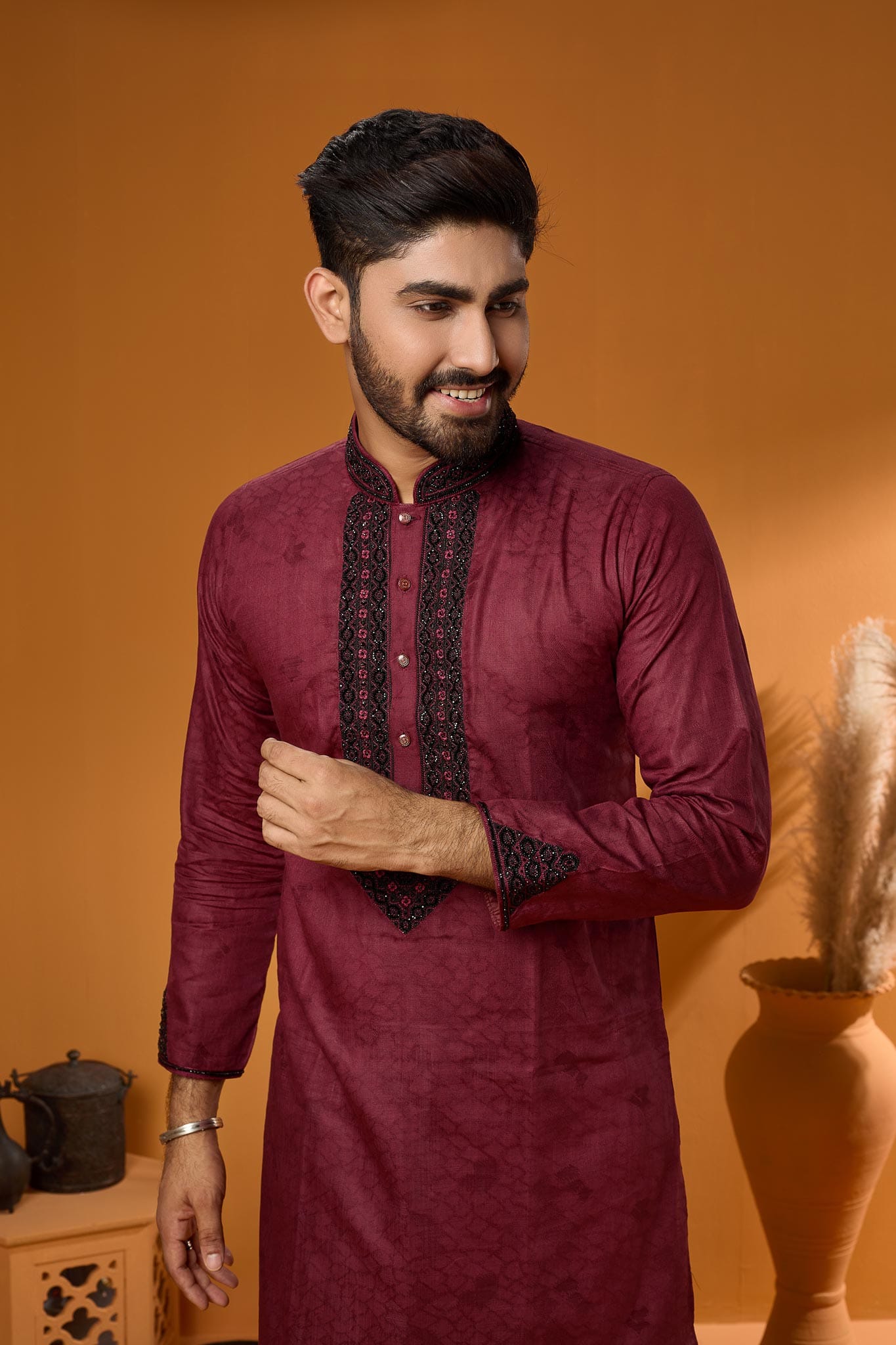 Introducing our Exquisite Panjabi. Tailored from Ultra Premium Jacquard Fabric, this Panjabi showcases Elegant Design and a Touch of sophistication. This Panjabi features a Floral design, The exterior Carry’s a rich Design on Collar, Chest And Sleeves. The Maroon, Golden and Black colour is carefully chosen to suit various preferences and occasions. Designed with attention to detail, The metallic buttons add a tasteful finishing touch elevating the overall look with a hint of glamour.